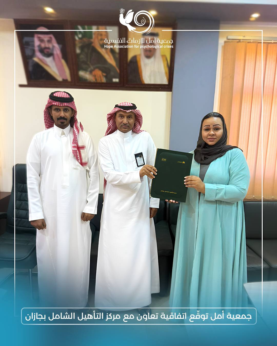 وقّعت جمعية أمل للأزمات النفسية اتفاقية تعاون مع مركز التأهيل الشامل بجازان، تهدف إلى تقديم برامج دعم نفسي وتأهيلي لأسر النزلاء، وتمكينهم من التعامل مع أبنائهم من